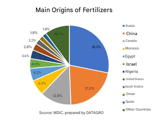 Russia remained Brazil’s main supplier, shipping 6.88 million tons, or 28.2% of the total, an increase of 18% year-on-year. China sharply expanded its share, exporting 5.14 million tons—21.2% of total imports—marking a 75.7% rise from 2024. Canada followed with 3.1 million tons, down 2.2% compared to last year.